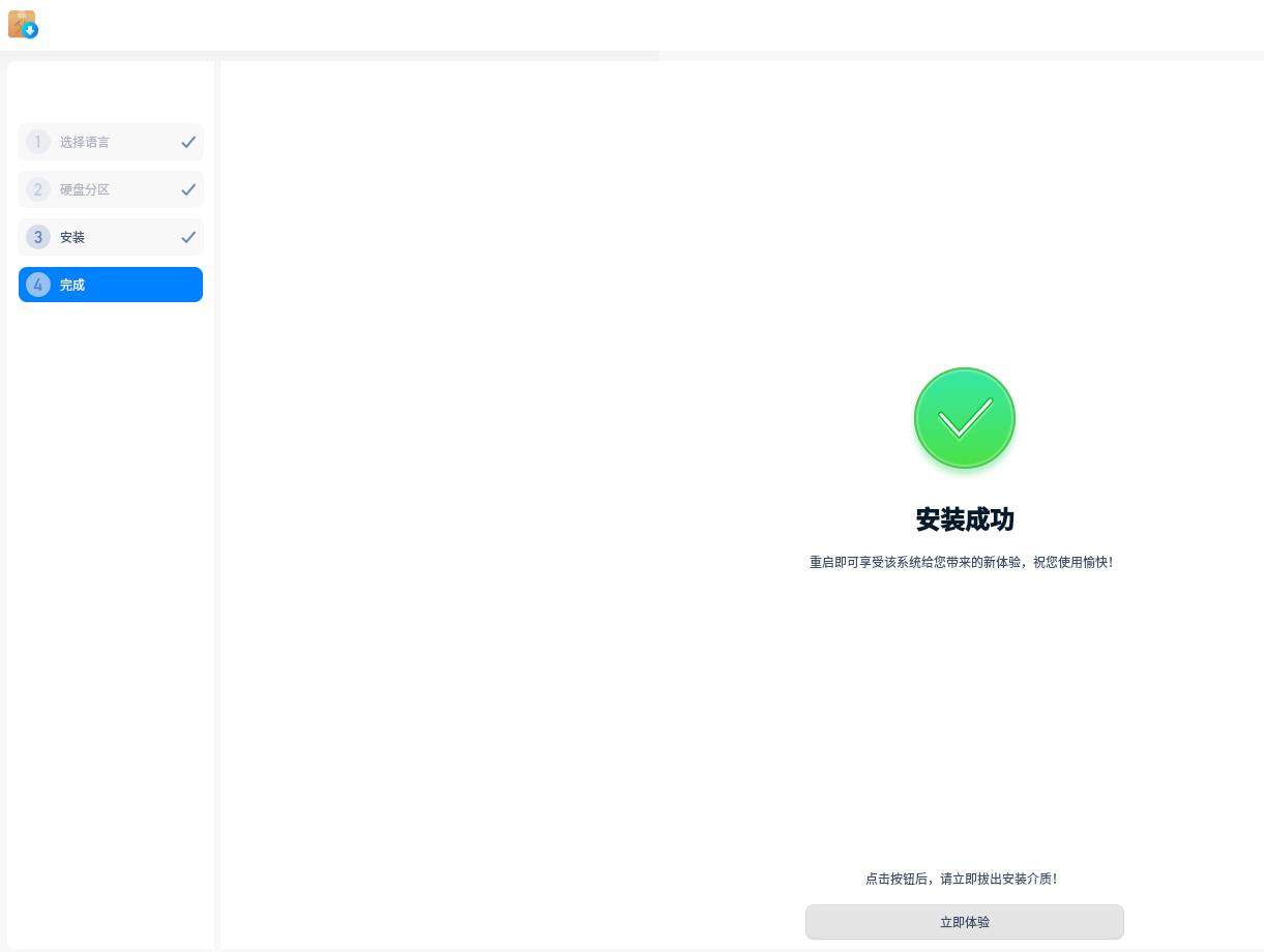 ? ? ? ? 7、安裝完成,點擊“立即體驗”,操作系統(tǒng)自動重啟。